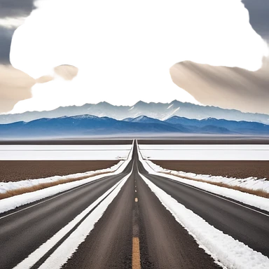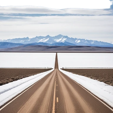 A long STRAIGHT dirt road that disappears into the horizon half way up the screen from the perspective of someone sitting in the middle of the road looking down it. Flat snow fields on both sides of the road with huge looming mountains above the roads horizon line. emoji