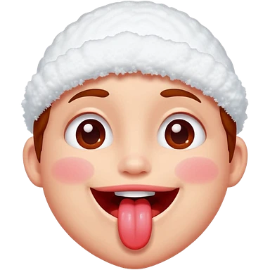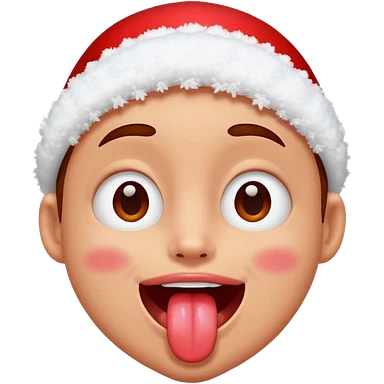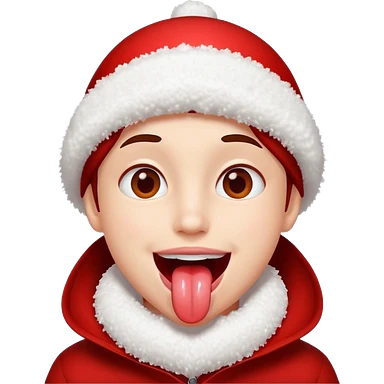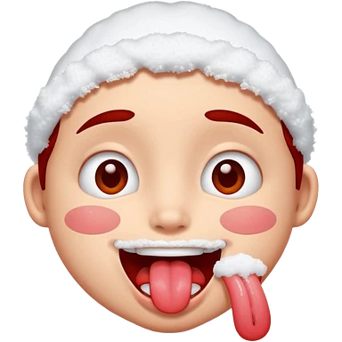 Someone got hit with a snowball and has snow on their face but is happy and smiling with their tongue out but their eyes are red emoji