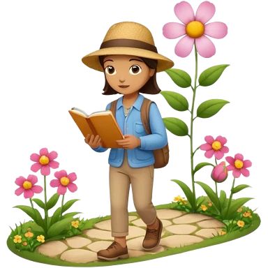 someone who's walking on a path and the person is reading a panel to learn about a flower emoji