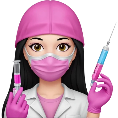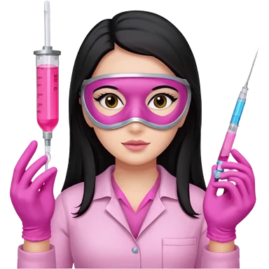 laboratorista con guantes rosa y mascarilla rosa jeringa tubo laboratorio sin lentes y ojos negros cabello largo negro color ojos oscuro emoji
