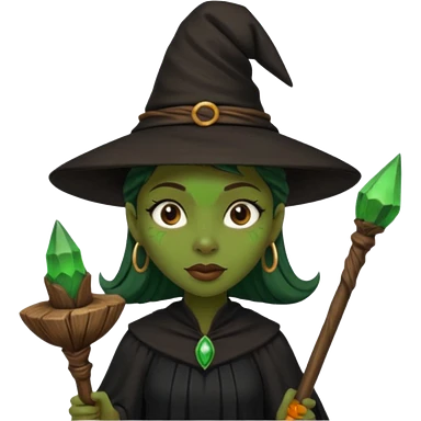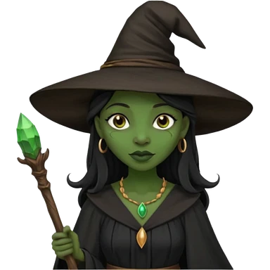 ведьма-африканка с зеленой кожей с широким носом просто в черном платье и черной ведьминской шляпе с посохом по талию emoji