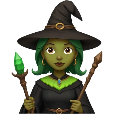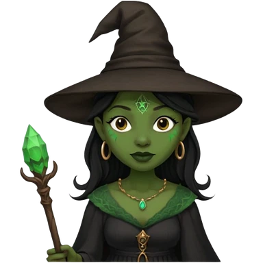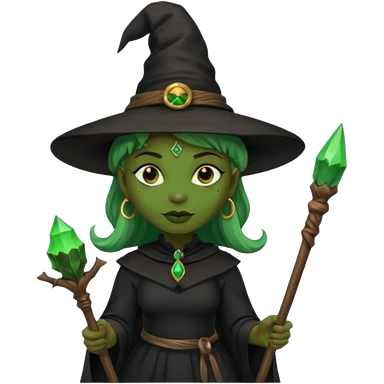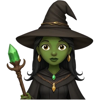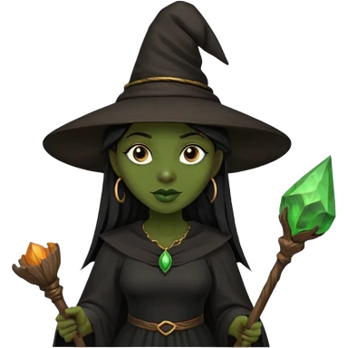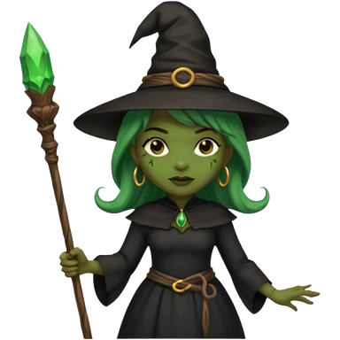 ведьма-африканка с зеленой кожей с широким носом в черном платье и черной ведьминской шляпе с посохом и длинными черными волосами emoji