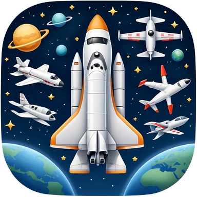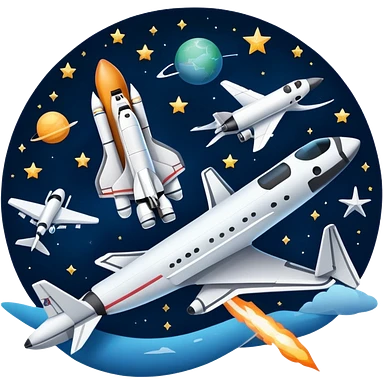An icon featuring a space shuttle and an airplane against a starry sky, symbolizing aerospace technology. The design includes rocket boosters and satellite orbits, representing the exploration of space and advanced aviation. Transparent background emoji