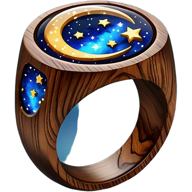 dark wood ring with epoxy resin in space and stars motifs crystal emoji