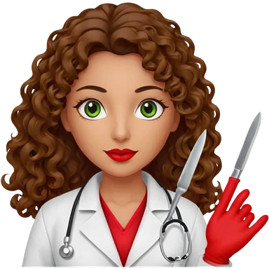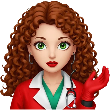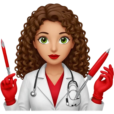 Spanish sexy evil woman. She has green eyes. had brown long curly hair. evil surgeon kills with needle wears red sexy doctor coat with red mouth bandana red gloves. emoji | AI Emoji Generator