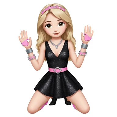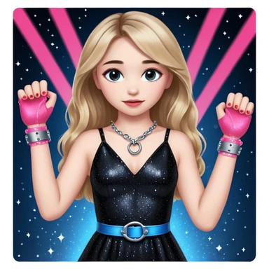 Sabrina carpenter at concert wearing a black sparkly dress with a silver sparkle v neck she is holding up pink handcuffs towards audience and kneeling, blue and red lights setting emoji