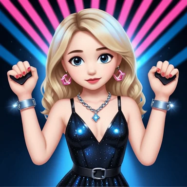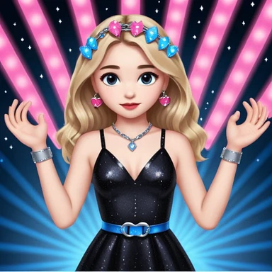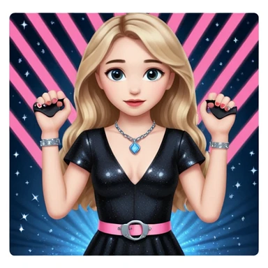 Sabrina carpenter at concert wearing a black sparkly dress with a silver sparkle v neck. she is holding up pink handcuffs. facing audience, blue and red lights setting emoji