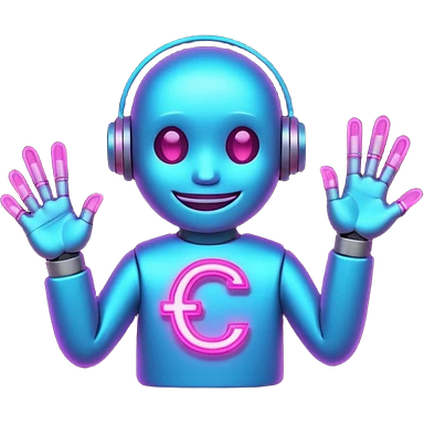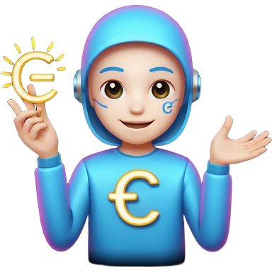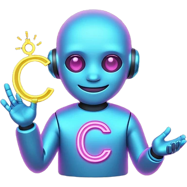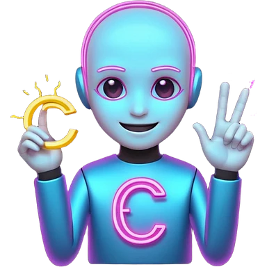 Tiny smiling cyber creature made of neon lines, holding a small glowing C symbol, with little sparks around it. emoji