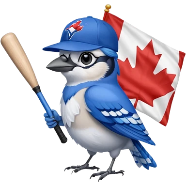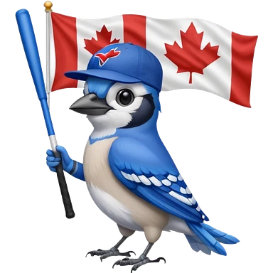 bluejay standing with baseball bat, wearing toronto blue jays baseball hat, holding Canada Flag emoji