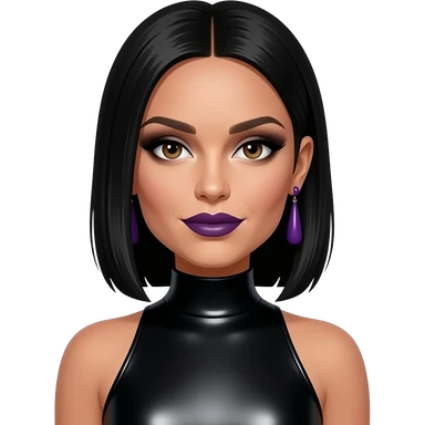 Victoria Beckham from Spice Girls with brown eyes, medium black straight hair, black eyeshadow, dark purple lipstick, black metallic high neck dress, dark purple earrings emoji
