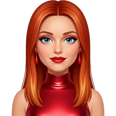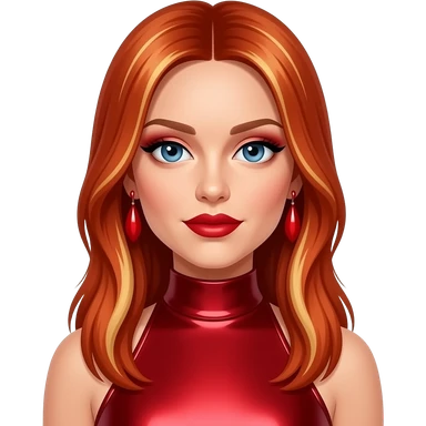 Ginger Spice from Spice Girls with blue eyes, long red hair with blonde highlights, red metallic sweetheart dress emoji