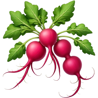 fresh radish, whole, round, pink-red, white root tip, smooth glossy, crisp, green leafy tops, no dirt, no slicing, no extras, soft lighting, emoji scale emoji