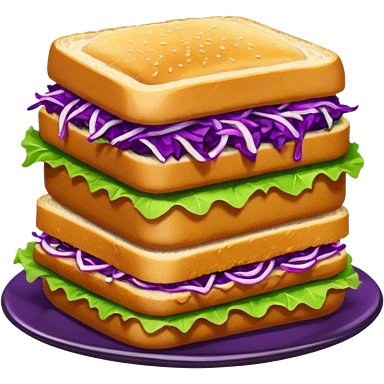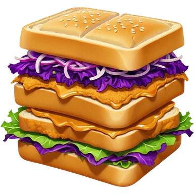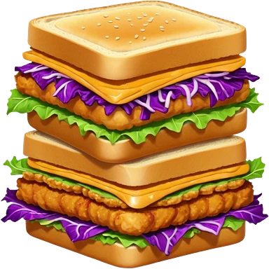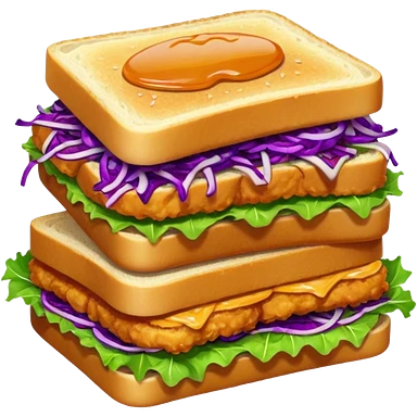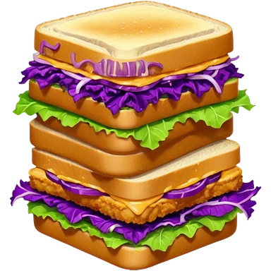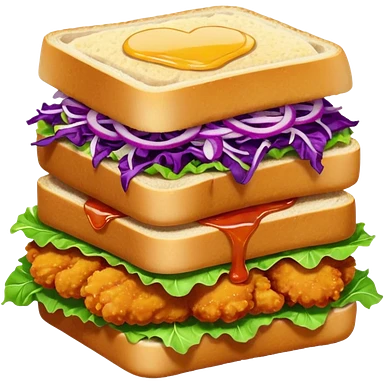 Spicy stacked chicken sandwich — two thick golden toast slices, a crispy breaded chicken fillet, green lettuce, and purple cabbage slaw, with glossy dark sauce dripping down the sides. emoji