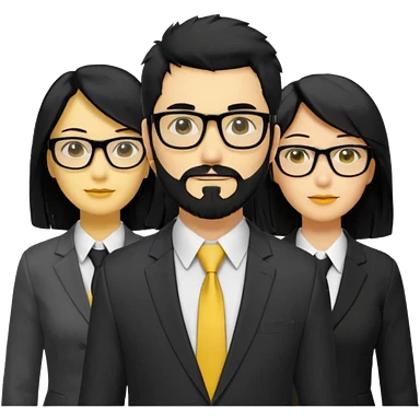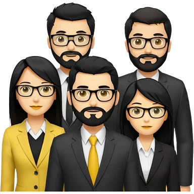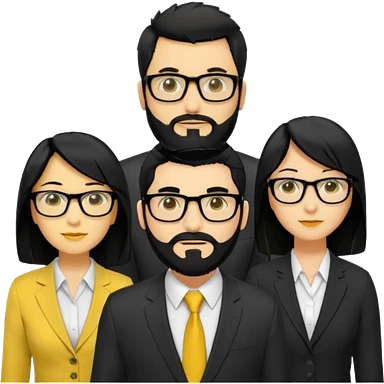 A work group avatar.Layout: two men (middle), two women (sides). Left woman: yellow skin, long black hair, glasses. Middle-left man: yellow skin, short black hair, thick black beard, shirt. Middle-right man: yellow skin, short black hair, no beard, suit. Right woman: yellow skin, long black hair. emoji