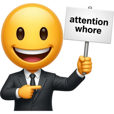 Yellow smiley pointing to screen holding up a sign sign that says "attention whore" emoji