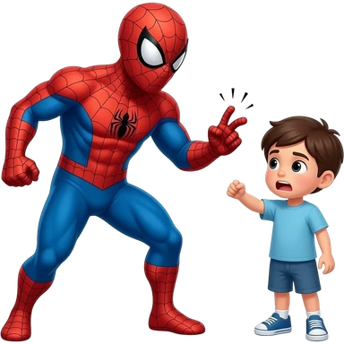 "A highly detailed and realistic Spider-Man standing in a rural farm setting with cows in the background. He has an exaggerated, cartoonishly wide grin, showing big white teeth, and is making a playful gesture by pointing to his head. The scene is bright and colorful, with a mix of realism and surreal humor, giving the image a funny and slightly eerie vibe emoji