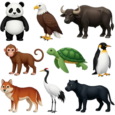 Black and white panda bear, brown and white bald eagle, black water buffalo, red orange spider monkey, green sea turtle, black and white macaroni penguin, blue seal, red wolf, white whooping crane, and black panther emoji