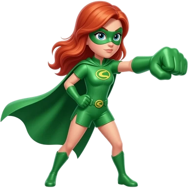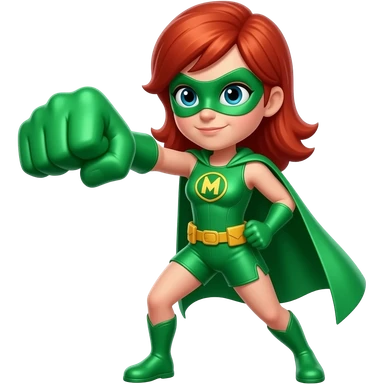 quiero que me hagas a una superheroina con el pelo pelirrojo mascara verde i con un traje verde que sea una niña cuerpo entero que este pegando un puñetazo mirando a la derecha emoji