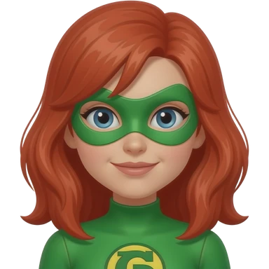 quiero que me hagas a una superheroina con el pelo pelirrojo mascara verde i con un traje verde que sea una niña sin orejas emoji