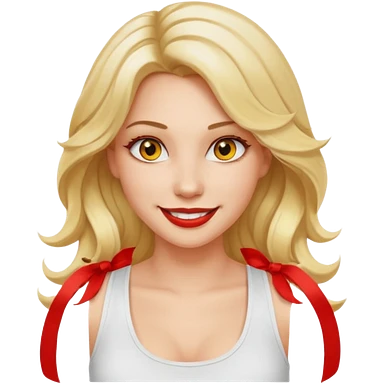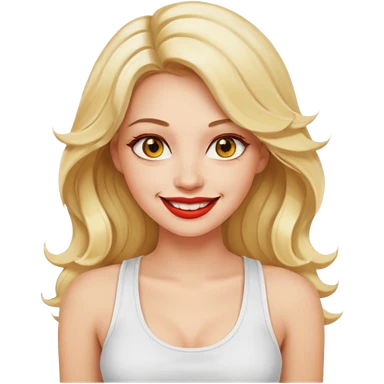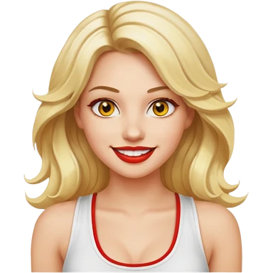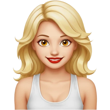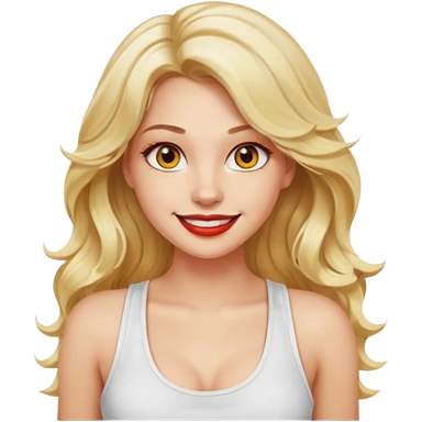 a woman with white tank top and smile, her hair is long wavy blonde hair, her face is baddie girl style, her eyes color are yellow and the color of her lip is soft red emoji