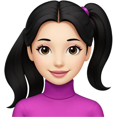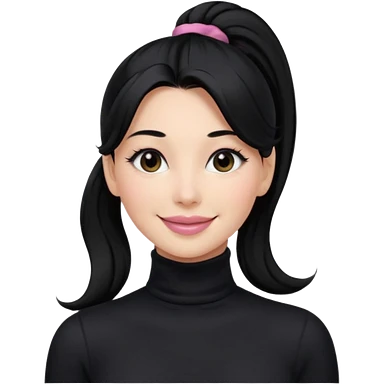 a woman with long sleeve turtle neck top and smile, her hair is long black pony tail, her eyes color are black and the color of her lip is soft pink emoji