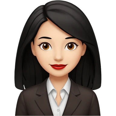 a woman with office outfits and smile, her hair is long black hair, her eyes are soft brown color and the color of her lip is soft red emoji