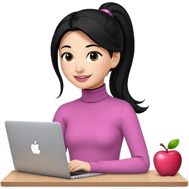 a woman with long sleeve turtle neck top and smile, her hair is long black pony tail, her eyes color are black and the color of her lip is soft pink with apple notebook (macbook). her jab is digital designer. emoji