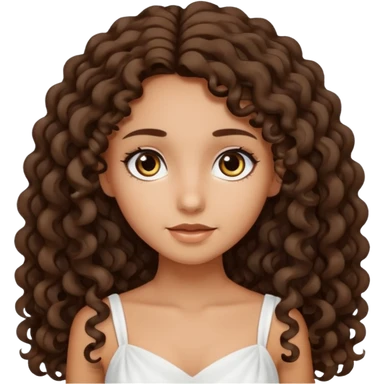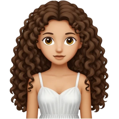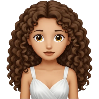 Light tanned skin girl with dark brown very long curly hair, dark eyes, white dress emoji