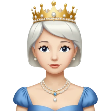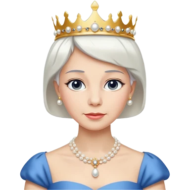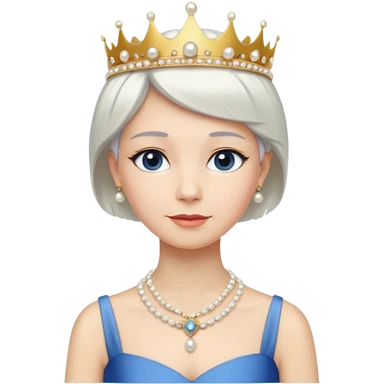 Queen with white short hair – gold tiara, pearl necklace, elegant gown, blue dress emoji