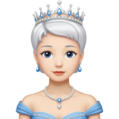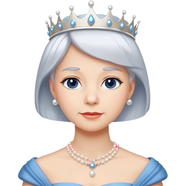 Queen with white short hair – silver tiara, pearl necklace, elegant gown, blue dress emoji