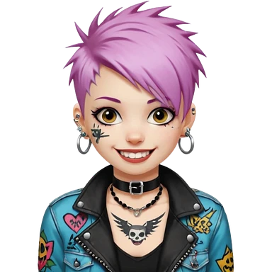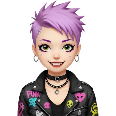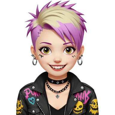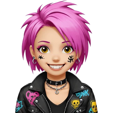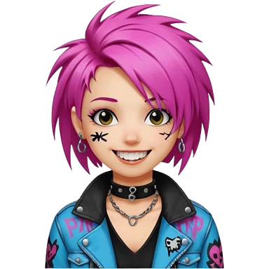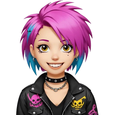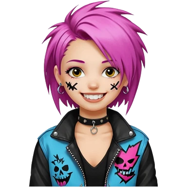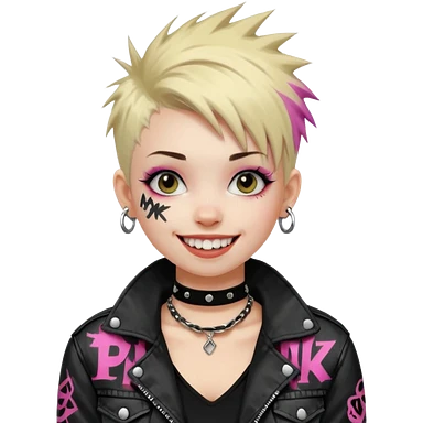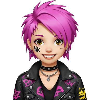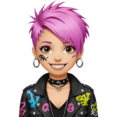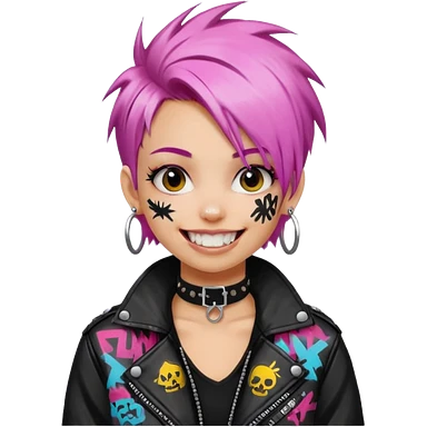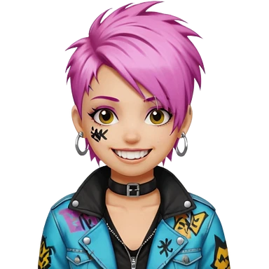 a punk girl with neck-length dyed hair and wear a punk graffiti jacket with black choker grin playfully emoji
