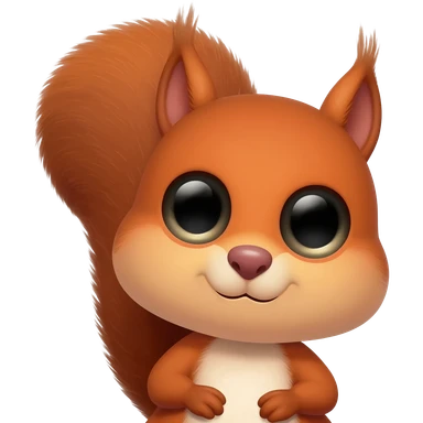 long curly blood red hair (darker), red pointed squirrel ears with black trim, black goth outfits, body and face human, blue eyes, more pointy chin, black lipstick, one big fluffy red squirrel tail with black tips, close her mouth, less evil looking emoji