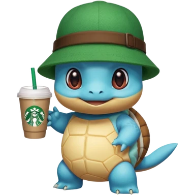 Squirtle with a Starbucks cup and a green hat emoji