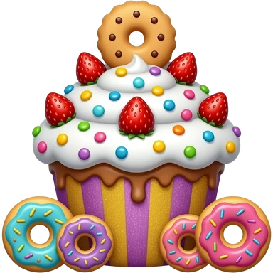a carnival float resembling a giant cupcake with glitter and multicolored candies on top. It should have three tiers with whipped cream and strawberries. At the top of the float, there is a large cookie stuck into it. The float has four wheels that look like donuts emoji