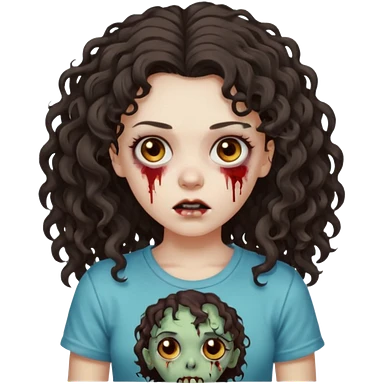 zombie girl with curly hair n brown eyes, dark and long hair 3a with wavy scalp, just a tshirt emoji