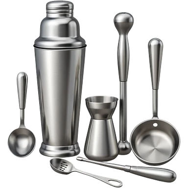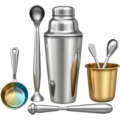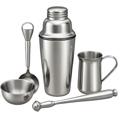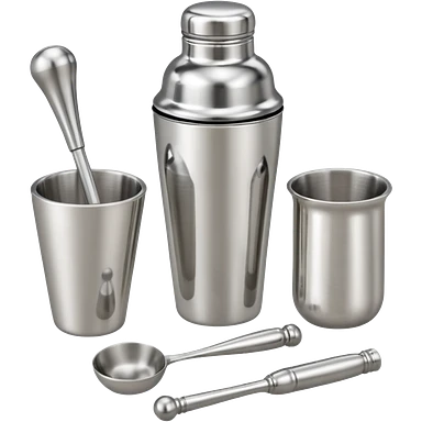 A metal shaker set including a shaker, jigger, and muddler neatly placed on the counter. emoji