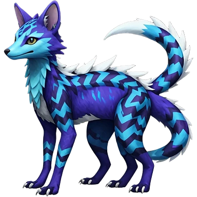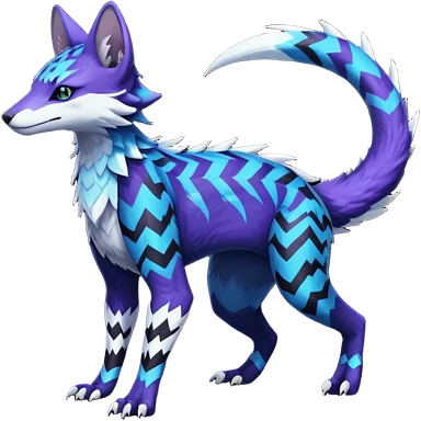 starry sparky fizzy Black-Dark-Vortexed Lightning-strike-zig-zag-patterned striking indigo-violet-blue-cyan-gradiented with dark undertones, white underside, thunderous stormy edgy badass realistic Vernid-Sergal-Genet-Trico-species by LiLaiRa, full body emoji