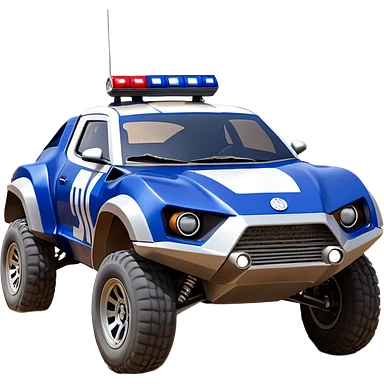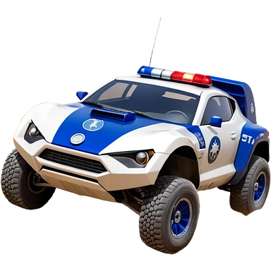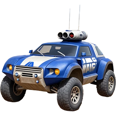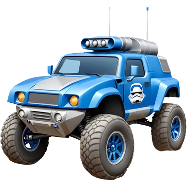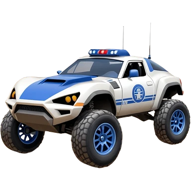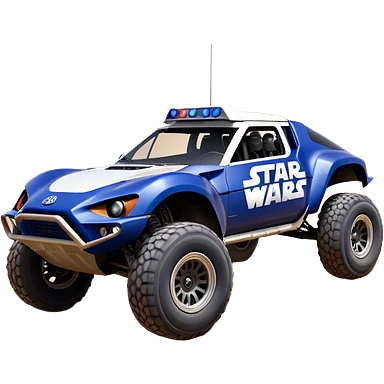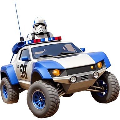 Star Wars’s storm trooper’s police evil darkly night blue Dirty and dented Local Motors Rally Fighter off road race car hot rod meets 2013 scion fr-s trophy truck-style basher flying down a dusty road (silver wheels) emoji