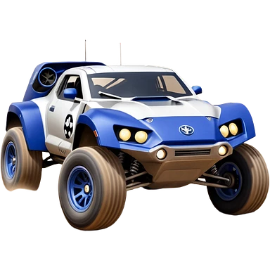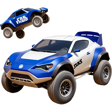 Star Wars storm trooper’s evil darkly night blue Dirty and dented Local Motors Rally Fighter off road race car hot rod meets 2013 Toyota 86 trophy truck-style basher flying down a dusty road (silver wheels) emoji