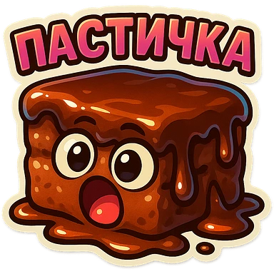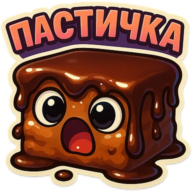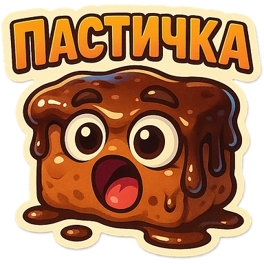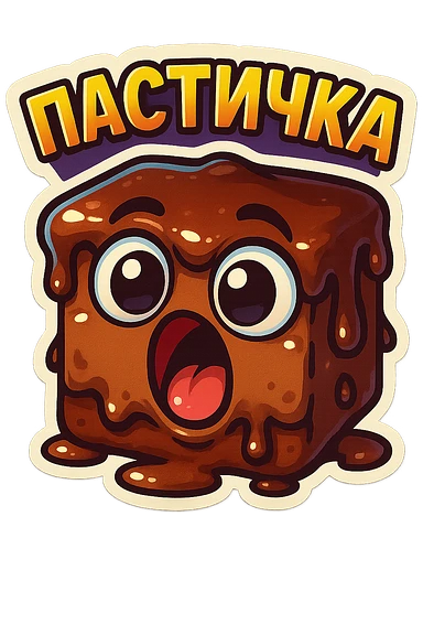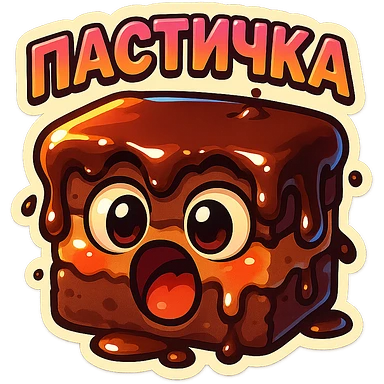Rectangular chocolate mini pastry, slightly messy and squished, chocolate dripping, big round eyes, wide open mouth, playful surprised expression, text above: "ПАСТИЧКА", chibi style, Twitch emoji style, transparent background, colorful emoji