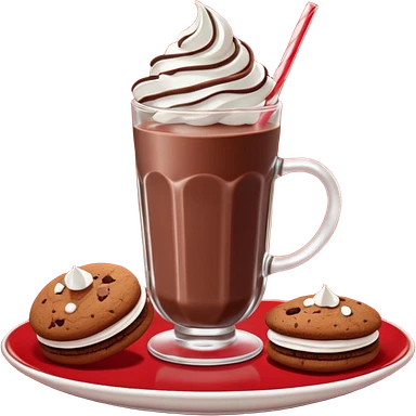 A glass of chocolate milk sits on a red saucer surrounded by chocolate cookies and sugar meringues. emoji