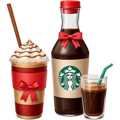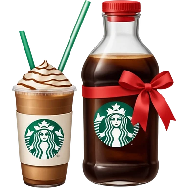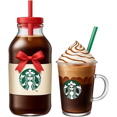 Starbucks iced espresso with milk and the cup has red ribbons printed on it. There is a bottle of cinnamon dolce syrup next to it emoji