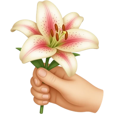 A hand holding a stargazer lilly flower towards the front view as if the flower is for the viewer emoji