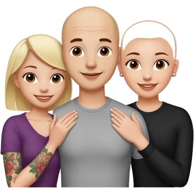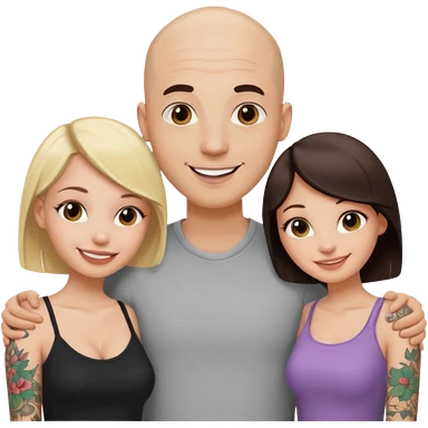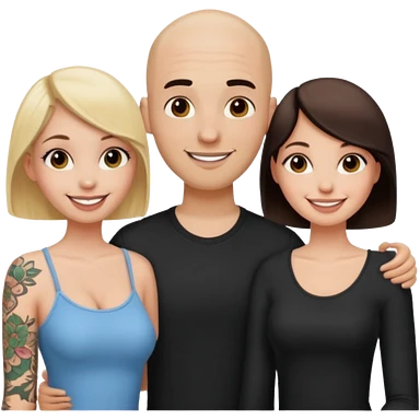 throuple tatted bald boyfriend with blonde girl friend and brunette girlfriend emoji