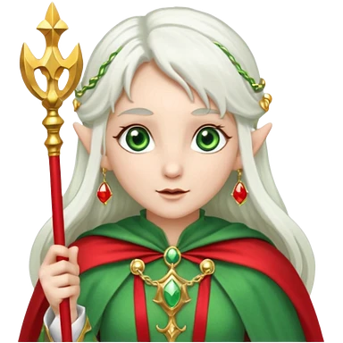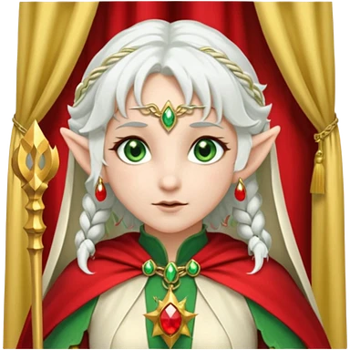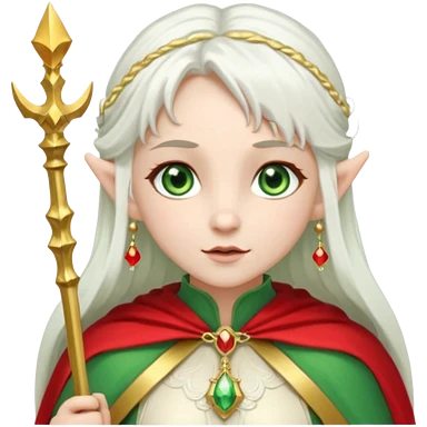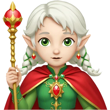 an elf with very white hair and two pigtails on the side of her head, she has a curtain bang, green eyes, she has a white cape with golden borders and a scepter with a red orb, she has earrings that look like red drops emoji