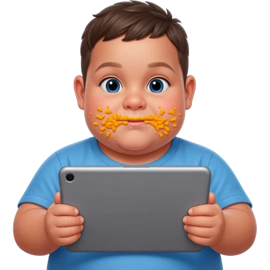 Fat American kid holding iPad with Cheeto dust around his mouth emoji