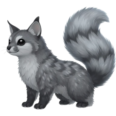 charcoal fur with silver frost-veins and ghost-dust sheen Hyper-realistic beautiful elegant pretty precious cute Fakémon-Pokémon-opossum-feline-serval-caracal-chinchilla-Furret-Minccino-hybrid-creature with a big fluffy bushy tail (full body) emoji