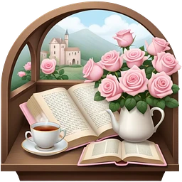 A cozy reading nook with an open book, a steaming cup of tea, and a bouquet of pale pink roses. emoji