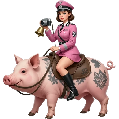 steampunk - A slim and seductive female rider in a pink German army uniform from World War II jumps on a large tattooed pig with a wooden camera on its bellows and pink high heels on her feet. emoji | AI Emoji Generator
