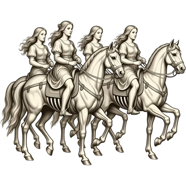 aesthetic brilliant radiant divine lighting, oil paint - ivory Four thin women as horsemen of the Apocalypse, after a graphic by Albrecht Dürer emoji